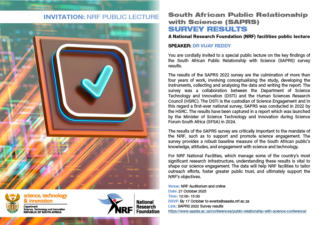 You are cordially invited to a special public lecture on the key findings of the South African Public Relationship with Science (SAPRS) survey results.