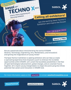 The Sasol Techno Exhibition is seeking exhibitors who can help us create a captivating experience that empowers youth to embrace the incredible opportunities within the STEAMI. Let’s unveil the boundless possibilities in the face of rapid technological advancement, global changes and and an uncertain future. Together, let’s inspire young changemakers to shape the world using the infinite potential that careers and innovation in STEAMI hold.